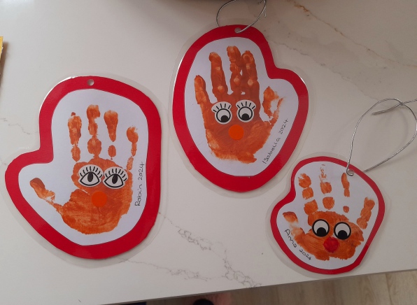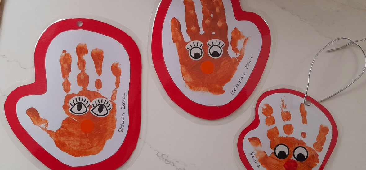 Simply paint your child's hand with brown paint (we usually paint the dominant hand, the one your child writes with) and make a hand print. When it is dry add two eyes (we used stickers but you could also use googly eyes) and a red dot for the nose. Cut out, glue onto red or green card and then laminate. Hole punch a small hole in the top and threat some christmas elastic so that it can be hung on the Christmas tree year after year