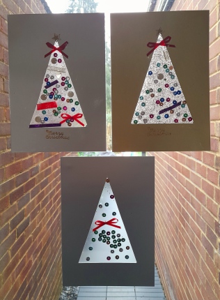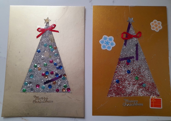 This is a good one for the tiny people in your setting or home. Cut out a shape in the middle of some gold or silver card and then place double sided tape on one side to cover this hole. Supply any bits and pieces for decoration. We used ribon, bows, sequins, wool, stickers and glitter (handy hint: put the glitter on last as nothing else will stick once the glitter is in place). Once finished decorating either laminate or cover with another piece of double sided plastic. They look great blue tacked to windows!