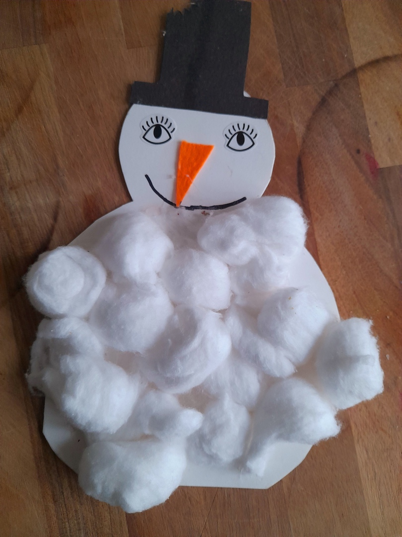 Use a white card and cut a snowman shape out, making sure the left hand side is still attached to the back of the card. Cut out some black hats (we used zig zag scissors to make a design in the top left corner) and some orange card or felt for the nose. Then simply let the children make their snowmen with glue and cotton wool. We used eye stickers but you could use googly eyes too.