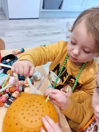 Once the children are adept at this activity make it a little trickier by offering them a plastic golf ball with holes in one hand and the pipe cleaner in another hand.