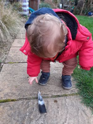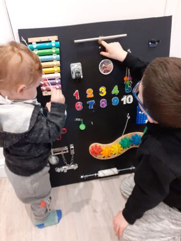 pom poms on golf tees - stick the golf tees into a small block of styraphome or playdough and invite the children to balance pom poms on top. When they get good at this with their fingers introduce pincers and encourage them to pick the pom poms up using the pincers and balancing them onto the golf tees