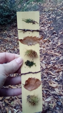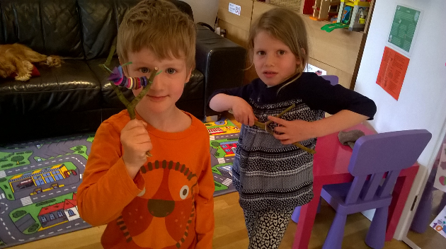 We collected lots of Y shaped sticks on our forest walk and when we got home we made musical instruments out of them by threading buttons onto wire and ribbon and by stretching loom bands over the Y part of the stick to make a guitar. Very good for fine motor skill development and for using imagination. They actually worked too.
