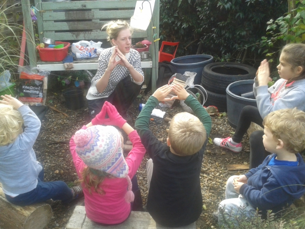 On the day the children couldn’t wait to start. Jo and I talked to them about safety and the importance of listening. J was the youngest at just under 2 years old and G the eldest at 9 years old and they were all excited to get started. We sat on logs in a semi circle once we’d made sure that there were no overhanging branches in the path of the our fire.