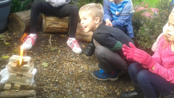 Next we talked about the three things that a fire needs. 1 – fuel (logs), 2 – oxygen (the air) and 3 – Heat. We talked about arranging the logs in a way that would allow the oxygen to get to the flames from all directions and everyone had a go at placing the supporting logs. C decided to put them into a triangular shape, whilst G and M made squares