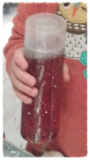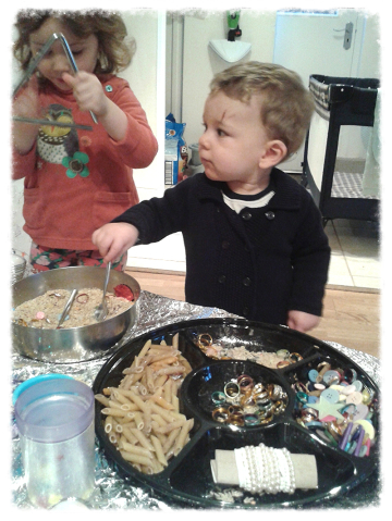 I set up a heuristic silver themed table at a low level which can be accessed by standing children in our playroom consisting of silver christmas baubles, a silver bowl with rice and silver glitter in, teaspoons, musical instruments, shiny buttons, pearly bracelets, egg cups, water bottles filled with hair gel with the lid glued on and added to the table each day. All of the children loved exploring, pouring, scooping, dipping, watching and interacting.
