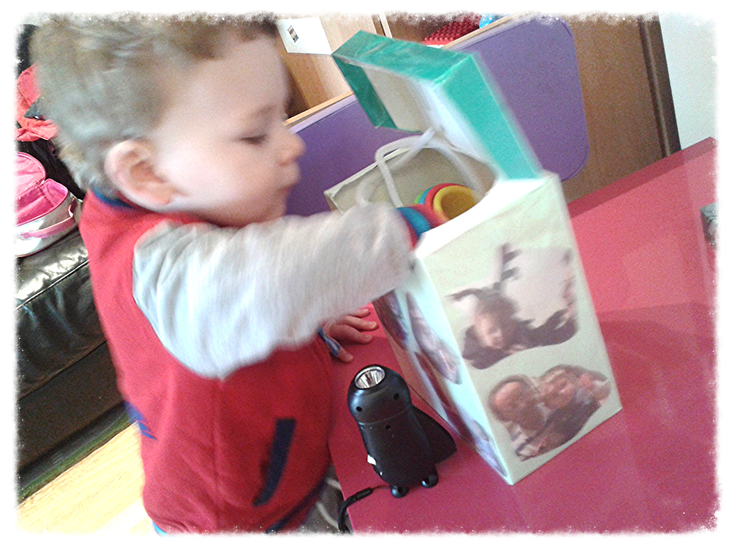 At home I filled my baby's photobox with his favorite toys. He enjoyed lifting the lid and exploring inside. We pointed at the photoraphs on the outside of the box naming the people in his family.