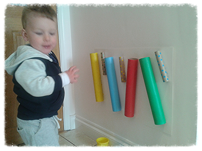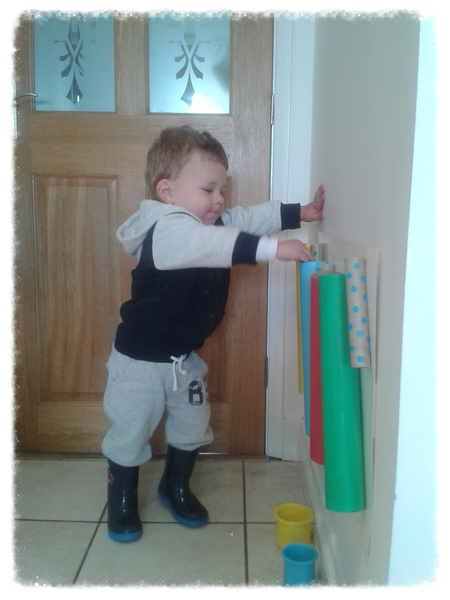 At home I mounted my ball run activity onto the wall. I offered the children a tray containing colourful pom poms, teaspoons, pincers, small plastic balls and stacking cups. I showed them how to post the pom poms and balls through the colourful tubes and let them fall out the bottom. We put the stacking cups underneath the tubes, matching up the colours and then dropped the pom poms down the tubes and tried to catch them in the cups. I played with the children and also let them explore and experiment themselves - hours of fun!