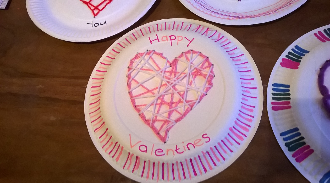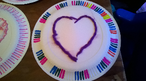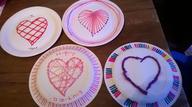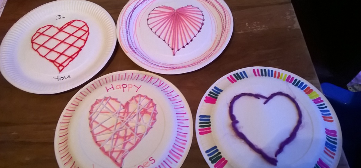 We used white paper plates. I drew a pencil heart shap into the centre of one plate, stacked 9 more underneath and then used a metal scewer to press holes around the heart shape. I gave each child a plate, they could decide which way up they wanted to do their design, a piece of coloured wool, a plastic needle and some coloured felt tip pens and pencils. I showed the children how to sew the first few stitches and helped them along the way as needed.