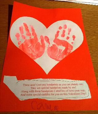 Another easy Valentine craft. I prepared the hearts and typed up the wording (that I found on Pinterest but changed slightly myself) and printed it all out before the children arrived. Each child painted one hand and printed onto one side of the heart, then painted the other hand and printed onto the other side of the heart. Next they cut out the words and stuck them onto the bottom of an A4 sheet of paper (or card) and wrote "love from .............." or just their name at the bottom. Once the paint on the heart was dry they used a glue stick to stick this to the top of the A4 red paper. We put them into A4 envelopes and sealed with a note on the front saying "do not open until Valentines Day". This activity was quick and easy for the children to do, instant gratification for them plus something for parents at home.