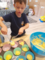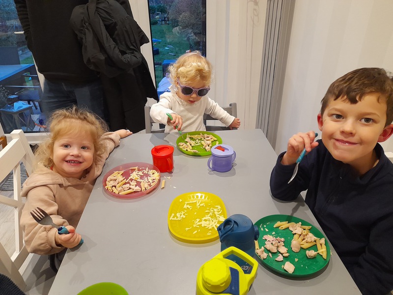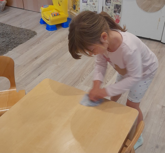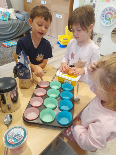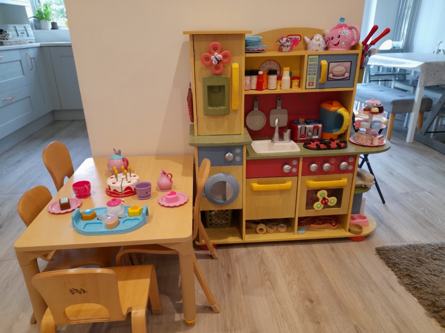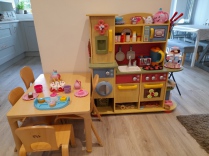 On the other side of our playroom, we have the open plan dining room/kitchen. This is where we eat our meals and snacks. There are various sized chairs, highchairs and a bench for different ages of children and we use appropriately sized plates, cups, bottles, spoons, forks and knives depending on each child’s age and ability. We encourage the children to sit whilst eating and to use this time as a good discussion opportunity. One of the children takes on the waiter role at each mealtime and carries the food from the kitchen to serve their friends. We also use the dining room table for activities such as jewellery making, painting, clay creations, Hama beads, Lego and other smaller pieced activities to keep them off the floor and away from the babies.