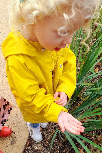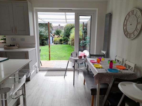 There are double doors in the dining room which lead straight on to a covered patio. These doors are kept open all year round so that the children can move from inside to outside at their own discretion. During very cold months we may close the doors for some of the day, but they are not locked so the children can use the handle to go outside or ask for our help if needed