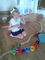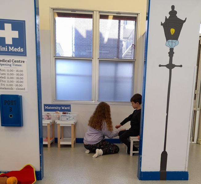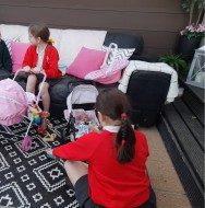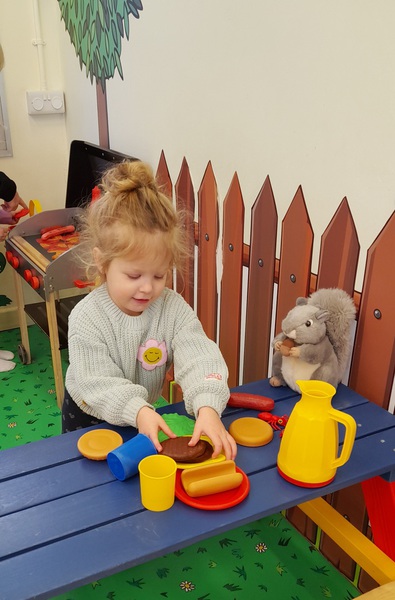At the other end of the patio (but not under cover) there is a small wicker sofa and chair with a low table. The children use this area for whatever they want such as doctors, bakery, dolls area, free mark making etc.