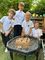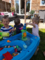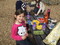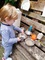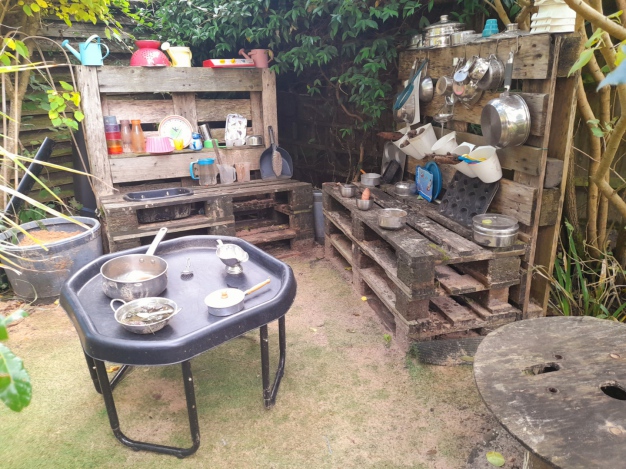 On the other side of the path from the Wendy house there is a large mud kitchen which has a sink, water supply, table and work space with one tub of sand and one tub of top soil. There are lots of pots and pans, utensils, jugs and natural objects such as sticks, feathers, conkers, leaves etc. The children play freely here and tidy up when they are finished. There is a dustpan and brush for them to use to tidy up with.