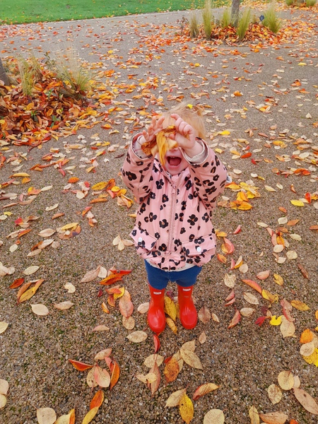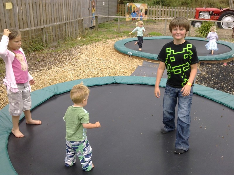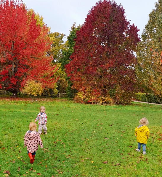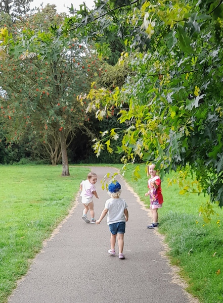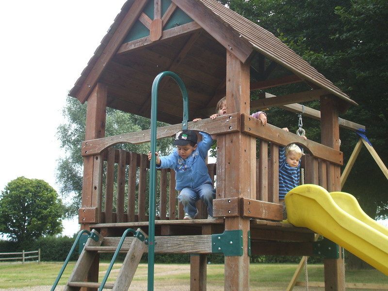 The patio leads to a large lawn area where the children can run free, roll down a small hill, kick footballs or get other toys and resources out. We often have a small climbing frame on the grass.