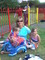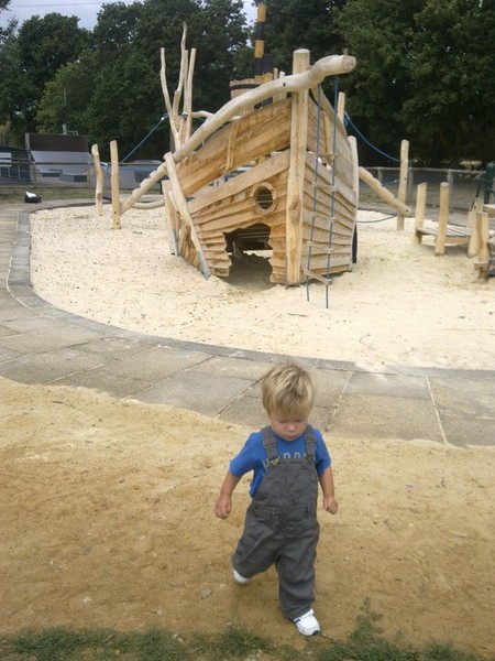 At the very bottom of the garden there is an area of astroturf with a climbing frame with swing, trapeze bar and slide. There is also a trampoline, ride on up and down slope and various other ride ons, which we swap around often. There is also a bug house down here where the bottom is screwed down but the top is moveable so the children can add to or take bits away. We also have large pieces of wood for free play building.