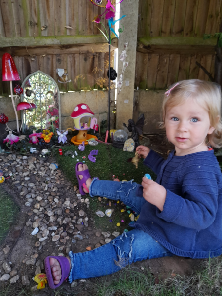Opposite the sand pit on the other side of the lawn is a fairy garden under a lovely tree. The children use their imaginations here as well as fine motor skills to move the small characters around. They play freely and often call me over to show me something or let me know if something is out of place or needs attention.